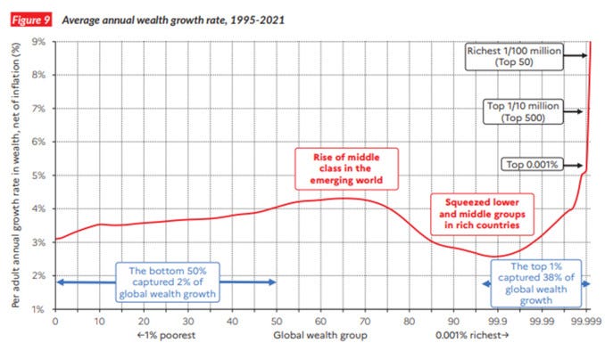 Between 1995 and 2021, 38% of global wealth growth accrued to the richest 1% (mostly to the richest 0.001%), while the poorest half of humanity received only 2% of the growth (Figure 1). This trend exacerbated inequalities in a world where the richest 10% controls 76% of the wealth, and the poorest half, again, accounts for a mere 2%.2