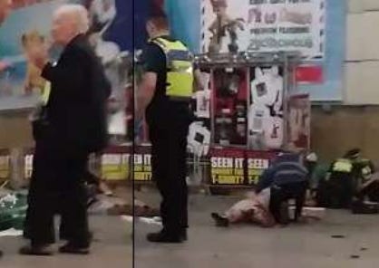 Nick Bickerstaff purportedly looking for his daughter in the aftermath of a terrorist attack in which he claims to have witnessed “people blasted to bits and half their bodies are everywhere.” No one around him seems to have noticed that a bomb has gone off, however.