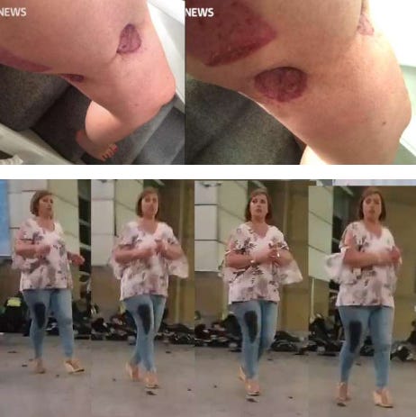 Ruth Murrell in the Barr footage apparently walking unimpeded despite her injury, which was reported by ITV news in the top images. Source: Hall (2020, p. 49).
